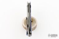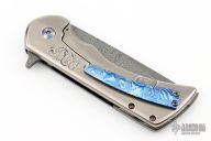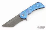This Honor Tanto Flipper from Rick Barrett has a Elmax Core San Mai Damascus tanto recurve blade with satin flats and a notched flipper. The handle has a polished timascus scale over a tumbled titanium frame, polished zirconium backspacer. Tip up Timascus clip, laser engraved dragon on the frame. Comes with a zipper case. Excellent condition.