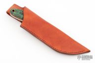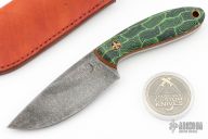 This Big Game Hunter by Trollsky Custom Knives features an acid stonewashed blade with .172" blade stock and 1.391" blade depth, full tang construction. The handle has green/black Damascus G-10 scales with natural canvas micarta liners, custom mosaic pin and a lanyard hole. Comes with a brown leather sheath. New from maker at the 2024 Blade Show.