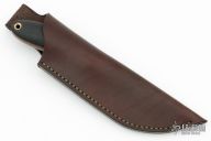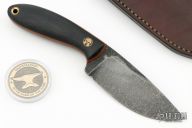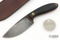 This Big Game Hunter by Trollsky Custom Knives features an acid stonewashed blade with .173" blade stock and 1.400" blade depth, full tang construction. The handle has black canvas micarta scales with natural canvas micarta liners, custom mosaic pin and a lanyard hole. Comes with a brown leather sheath. New from maker at the 2024 Blade Show.