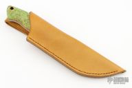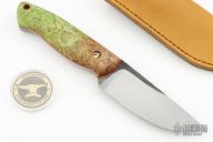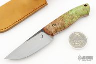This Wanderer by Trollsky Custom Knives features a hand rub satin finished blade with .178" blade stock and 1.379" blade depth, full tang construction. The handle has stabilized maple burl scales with red liners, custom mosaic pin and a lanyard hole. Comes with a tan leather sheath. New from maker at the 2024 Blade Show.