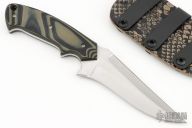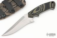This Bob Kasper design "Vipper " by Crawford Knives features a hand rub satin finished blade with notched thumbrest and sharpened top edge, .163" blade stock and 1.804" blade depth, full tang construction. The handle has green/black G-10 scales. Comes with a kydex sheath and COA. New from maker at the 2024 Blade Show.