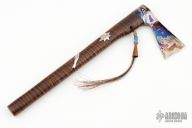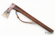 This Baby Tomahawk by Master Smith Hugh Bartrug features a fire blued Damascus head with 1.5" blade length and 3.5" from blade edge to poll. The handle has a curly maple haft with nickel silver star and fish overlay. Comes with a zippered case and makers card. Excellent condition.