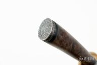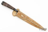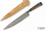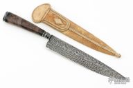 This knife by Jose Luis Chaves features a Feather Damascus blade with false top edge and an integral fluted guard, .135" blade stock and 1.324" blade depth, hidden tang construction with a fluted Damascus butt, maple burl wood grip. Comes with a brown leather sheath. New from maker at the 2024 Blade Show!