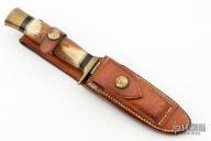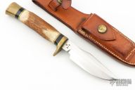 This Model H by Ralph Bone features a satin finished blade with sharpened top edge, .184" blade stock and 1.022" blade depth, hidden tang construction. The handle has a brass guard and butt, black and brass spacer, stag grip. #319 on the blade. Comes with brown leather sheath. Has some light patina, otherwise excellent condition.