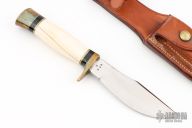 This Model u by Ralph Bone features a satin finished blade with notched thumbrest, .1618" blade stock and 1.212" blade depth, hidden tang construction. The handle has a brass guard and butt, black and brass spacer, mammoth ivory grip. #348 on the blade. Comes with brown leather sheath. Has a crack running the length of the grip, otherwise excellent condition.