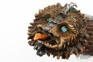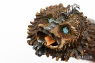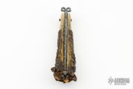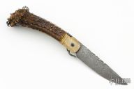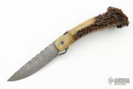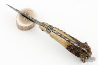 This Forged Scroll Friction Folder by Larry Fuegen features a Damascus blade with carved and engraved spine and friction bar. The handle is carved from a single piece of crown stag with fileworked nickel silver liners, fileworked steel backspacer, Blue topaz stones set in gold bezels for eyes, fossil walrus ivory tongue that moves inside the mouth. Every inch of this knife has been embellished, including the entire inside of the knife. Excellent condition.