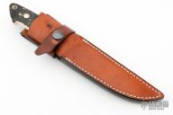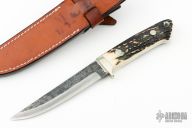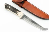 This sheath knife by Shosui Takeda features a san-mai drop point blade, .162" blade stock and .931" blade depth, hidden tang construction. The handle has nickel silver guard, and a 2-piece stag grip with nickel silver pins. Comes with a brown leather sheath. Handle by Moriya. Excellent Condition.