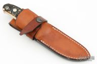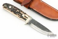 This knife by Shosui Takeda features a san-mai drop point blade, .147" blade stock and 1.023" blade depth, hidden tang construction. The handle has nickel silver guard, and a 2-piece stag grip with nickel silver pins. Comes with a brown leather sheath. Handle by Moriya. Has some patina otherwise the knife is in Excellent Condition.