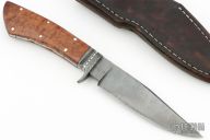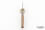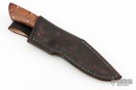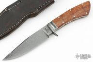 This Gentleman's Bowie by Journeyman Smith Stephan Fowler features a Ladder Pattern Damascus blade with a false top edge, .206" blade stock and 1.213" blade depth, file worked frame tang construction. The handle has a mosaic Damascus guard, stainless accent, pinned curly Koa grip with fileworked and fluted stainless steel spacers. Comes with a brown leather sheath and a zippered case. Comes with COA dated Blade Show 2024. New from maker at the 2024 Blade Show.