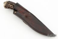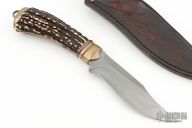 This Fighter by Anders Hogstrom features a 1050 steel blade with beautiful hamon, .242" blade stock and 1.295" blade depth, hidden tang construction. The handle has a textured brass guard, beautiful stag grip with anodized spacer, and brass butt cap with lanyard bail. Comes with a hand tooled brown leather sheath zipper case. Excellent condition.