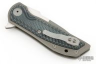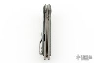 This Flipping folder from Don Lozier features a two-tone finished drop point style blade with swedge, notched thumb rest and flipper. The handle is comprised of green and black G10 scales over bead blasted and satin finished titanium frame and barrel spacers. Bead blasted tip up titanium pocket clip. Lanyard hole in pommel. Includes padded and zippered case, maker's card and COA dated 2016. Has some light scratches, otherwise excellent condition.