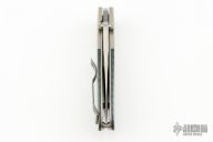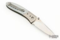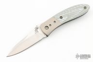 This LCC linerlock folder by Greg Lightfoot features a satin finished blade with dual thumbstuds, notched thumbrest. The handle has matching satin finished titanium bolsters, silver twill carbon fiber scales, blasted titanium liners, tip up clip, and satin finished posts. This is the Model that inspired the collaboration between Microtech and Greg Lightfoot. Comes with felt pouch. Has a couple light scratches, excellent condition.