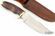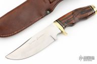 This knife by Sven Gustav features a satin finished blade with .191" blade stock and 1.649" blade depth, hidden tang construction. The handle has a brass guard and butt with a rosewood grip, black/brass spacers. Comes with a brown leather sheath. Has a couple scratches, otherwise good condition.