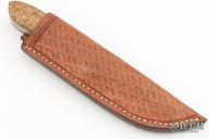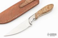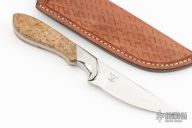 This knife by Charles Haines features a mirror polished blade with .144" blade stock and 1.091" blade depth, full tang construction. The handle has stainless steel bolsters, maple burl scales with white liners. Comes with a hand tooled brown leather sheath. Has a couple light scratches, otherwise excellent condition.