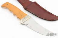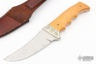 This knife features a satin finished blade with fileworked spine, .152" blade stock and 1.489" blade depth, full tang construction. The handle has engraved nickel silver bolsters, yellow paper micarta scales. Comes with a brown leather sehath. Has a few light scratches, otherwise excellent condition.