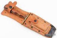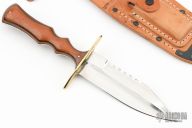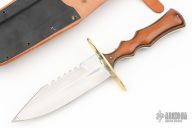 This knife from Alex J Collins features a mirror polished blade with sharpened top edge and sawteeth on the spine, .151" blade stock and 1.295" blade depth, full tang construction. The handle has a brass guard with Westinghouse paper micarta scales. Has some light scratches, otherwise excellent condition. Comes with a brown leather sheath.