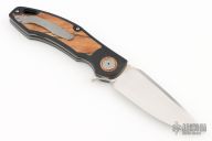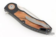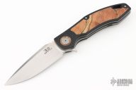 This H4 Standard Linerlock Flipper by Riaan Manser features a satin finished drop point blade with a notched thumb ramp and flipper tab.  The handle has G10 scales, spalted maple inlays and bead blasted titanium liners with a matching tip up pocket clip.  Includes a padded case and COA.  Excellent Condition.