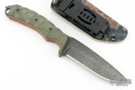 This Drifter by Kraken Tactical features a stone washed blade with notched thumbrest, .163" blade stock and 1.277" blade depth, full tang construction. The handle has green G-10 scales with orange liners. Comes with a kydex sheath, COA and original box. New from maker.