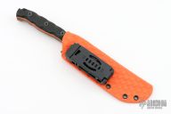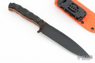 This Cami Medium Field Knife by Kraken Tactical features a matte black blade with swedge, notched thumbrest, .197" blade stock and 1.368" blade depth, full tang construction. The handle has green G-10 scales with orange liners. Comes with a kydex sheath, COA and original box. New from maker.
