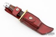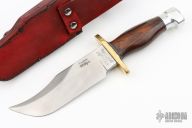 This Bowie Knife by J Nowill & Sons features a satin finished blade with false top edge, .248" blade stock and 1.644" blade depth, hidden tang construction. The hand has a brass guard a rosewood grip with black/grey spacers, aluminum butt. Comes with a brown leather sheath. Has some scratches and light pitting, otherwise good condition.