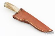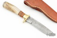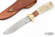 This knife by Robert F Chaffin features a Damascus blade with a visible temper line, .204" blade stock and 1.066" blade depth, hidden tang construction. The handle has a brass guard, stag grip with wood and black spacers, stag butt. Comes with a brown leather sheath. Has a few light scratches, otherwise excellent condition.