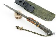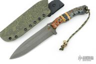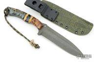 This Erebus Field Knife by Kraken Tactical features a stonewashed blade with swedge, notched thumbrest, .188" blade stock and 1.553" blade depth, full tang construction. The handle has Tassie Oak, Black and Yelloe Trustone and Blue Birch scales with black liners and brass spacers. Comes with a kydex sheath, COA and original box. New from maker.