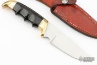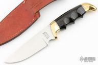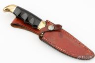 This Model 1034 Hunter by Kershaw Knives features a mirror polished drop point blade with notched thumbrest, .165" blade stock and 1.417" blade depth, hidden tang construction. The handle is comprised of brass guard and pommel, steel spacers and hand contoured phenolic handle. Includes leather sheath with belt loop. Has some scratches, has been resharpened, otherwise good condition. This model has been discontinued. The blade reads "I LOVE YOU MARCI 9-1-84"