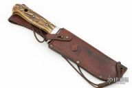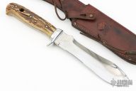 This White Hunter by Puma is the ultimate outdoorsman’s knife, originally designed by African professional hunters. It features a curved blade for cutting, slicing and skinning and a strong back edge for hacking. Handmade by skilled craftsmen with stag scales. Comes with original brown leather sheath. Has some scratches, the markings have been polished off, otherwise good condition.