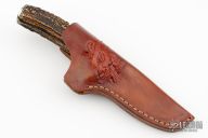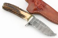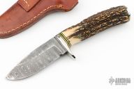 This knife by TD Bennett features a Damascus blade with .169" blade stock and 1.301" blade depth, hidden tang construction. The handle has a nickel silver guard and butt, stag grip, black/yellow spacers. Comes with a hand tooled brown leather sheath. Excellent condition.