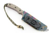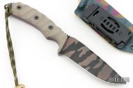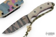 This Drifter by Kraken Tactical features a custom camo blade with notched thumbrest, .171" blade stock and 1.358" blade depth, full tang construction. The handle has tan G-10 scales with pink liners. Comes with a kydex sheath, COA and original box. New from maker.