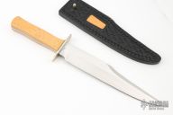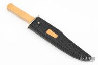 This Bowie by Gorden Johnson features a hand rub satin finished blade with false top edge, .183" blade stock and 1.469" blade depth, full tang construction. The handle has a nickel silver guard, Westinghouse yellow paper micarta scales with black liners. Has a few light scratches, otherwise excellent condition. Comes with hand tooled black leather sheath with yellow paper micarta inlay. #013