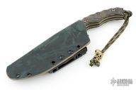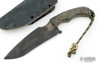 This Raptor by Kraken Tactical features a custom dark camo blade with notched thumbrest, .175" blade stock and 1.624" blade depth, full tang construction. The handle has fat carbon scales with brass liners. Comes with a kydex sheath, COA and original box. New from maker.
