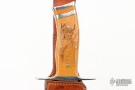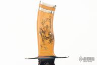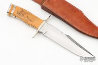 This Bowie from Ken Steigerwalt features a mirror finished clip point blade with a sharpened top edge and fileworked spine and tang with yellow paper micarta inlays, .242" blade stock and 1.691" blade depth, full tang construction. The handle has a nickel silver guard and pommel, Westinghouse yellow paper micarta scales with scrimshaw by JM Brady dated 8/86. Comes with a brown leather sheath. Has a few light scratches, otherwise excellent condition.