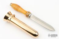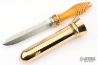 This is a handsome and traditional piece of equipment manufactured to rigid U.S. Navy specifications originally set down in the 1929 Hull Standard Plan Drawing and cherished by Navy and commercial divers throughout the world. It has a 7" stainless steel blade with a clear Maple handle. The knife screws into the top 1/2" of the cast brass sheath using Acme threads which not only hold it securely in the sheath but also permit it to be easily and quickly removed. The upper edge of the knife blade is cut with saw teeth while the lower edge is a conventional knife edge. It is as much sought after by collectors for its unique design and appearance as by divers for its utility underwater. Excellent condition. #0304