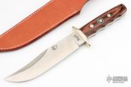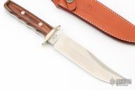This Bowie from Rigid Knives features a satin finished blade with a false top edge, .216" blade stock and 1.486" blade depth, full tang construction. The handle has a nickel silver guard with dymondwood scales. Comes with brown leather sheath. Excellent condition.
