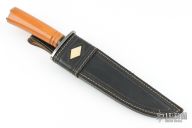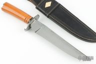 This Bowie by Bryan Crow features a mirror polished blade with false top edge, .239" blade stock and 1.550" blade depth, hidden tang construction. The handle has steel guard, nickel silver butt, Westinghouse yellow paper micarta grip. Comes with a hand tooled black leather sheath. Has some light scratches and pitting, otherwise good condition.