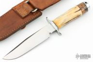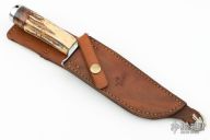 This Figther by Fred George Millard features a hand rub satin finished blade with false top edge, .186" blade stock and 1.253" blade depth, hidden tang construction. The handle has a stainless steel guard and aluminum butt, stag grip with red and spalted wood spacers. Blade is stamped #213 and dated 1998. Comes with a brown leather sheath. Excellent condition.