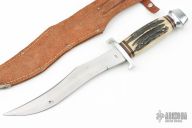 This Siberian Skinner by G.C. Co features a mirror polished blade with false top edge, .234" blade stock and 1.159" blade depth, hidden tang construction. The handle has an aluminum guard and butt with a stag grip and black/red/white spacers. Comes with a brown leather sheath. #431 on the blade. Has scratches and a few oxidation spots, otherwise good condition.