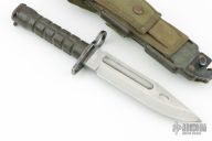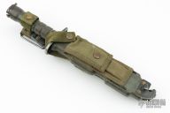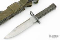 This M9 Phrobis III features a bead blasted spear point blade with sawteeth on the spine and a large fuller, .233" blade stock and 1.448" blade depth, hidden tang construction. The handle has a black steel guard and green plastic grip and can be removed from the handle for cleaning. Comes with original sheath. Has scuffs and scratches, has been used and sharpened, good user condition.