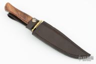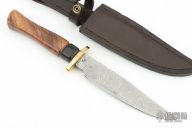 This Bowie by William Miller features a Damascus blade with false top edge and fileworked spine, .261" blade stock and 1.280" blade depth, hidden tang construction. The handle has a brass guard, wood grip with fluted ebony wood spacer. Comes with a black leather sheath. Has a crack in the spacer, otherwise excellent condition.
