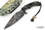This Dolos by Kraken Tactical features a black blade with custom Hannya laser etch, notched thumbrest, swedge, .194" blade stock and 1.592" blade depth, full tang construction. The handle has textured black scales with brass liners. Comes with a kydex sheath, and COA. New from maker.
