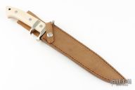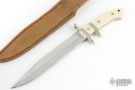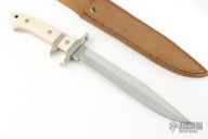 This Sub Hilt Fighter from Steve Voorhis features a mirror polished clip point blade with sharpened top edge, .215" blade stock and 1.200" blade depth, full tapered tang construction. The handle is comprised of a nickel silver guard and sub hilt, ivory paper micarta scales over red liners. Comes with brown leather sheath. Has a couple light scratches, otherwise excellent condition.