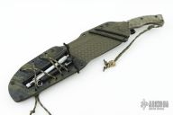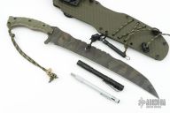This Alexanders Ginunting by Kraken Tactical features a custom multicam blade with notched thumbrest, .185" blade stock and 1.862" blade depth, full tang construction. The handle has custom OD green/tan scales with black liners. Comes with a kydex sheath with light, fire steel, and COA. New from maker.