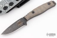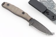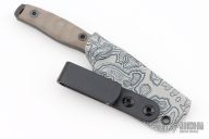 This Compact Field Skinner by Kraken Tactical features a stonewashed blade with notched thumbrest, .171" blade stock and .683" blade depth, full tang construction. The handle has tan G-10 scales with black liners. Comes with a kydex sheath, COA and original box. New from maker.