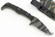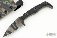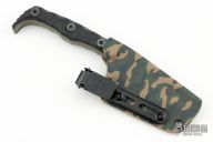 This Toofpick by Kraken Tactical features a custom camo blade with notched thumbrest, .181" blade stock and 1.030" blade depth, full tang construction. The handle has black G-10 scales with OD liners. Comes with a kydex sheath, COA and original box. New from maker.