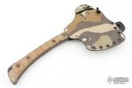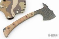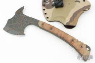 This Headhawk by Kraken Tactical features a Wolf Grey/Lightning Etch finished 3.25" blade and a spike at the rear, .198" blade stock, full tang construction. The handle has Scortched tan scales with black liners. Comes with a kydex sheath that has a belt clip, COA and original box. New from maker!