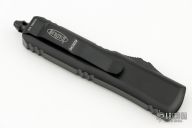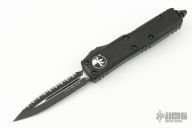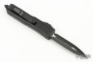 This UTX-85 OTF automatic by Microtech knives features a D/E black double edged blade with a fully serrated edge, and a black aluminum handle with black hardware, tip down carry. Glass breaker. S/N 109310. Dated 04/2024. Comes with original box and papers. New condition.