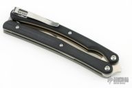 This BaliTac by Max Knives is a Grind Tactical Deisgn. It features a satin finished blade with fullers. The handles have Black G-10 scales, bead blasted titanium liners and T-latch, tip up stainless steel clip. Comes with velcro case and COA #92/150. New from maker.