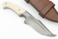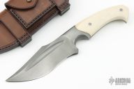 This magnum from the Sobral Brothers features O1 steel that has been forged into a beautiful finished product. It has a clip point recurve blade with a fuller and false top edge, .273" blade stock and 1.627" blade depth, full tapered tang integral construction. The handle features ivory G10 scales with laser engraved pins. Comes with a brown leather sheath. Excellent Condition.