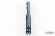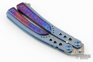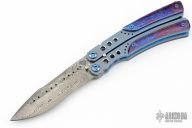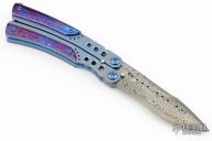 This Lambo 5 Balisong by Patrick Famin features a Damascus blade with milled fullers. The handles are two-tone anodized titanium with mokuti overlays and anodized titanium hardware, jeweled interiors. Excellent condition.